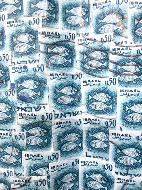 Alamoosa Hospital, Saudi Arabia. Postage stamps on board, 48”H x 60”L.