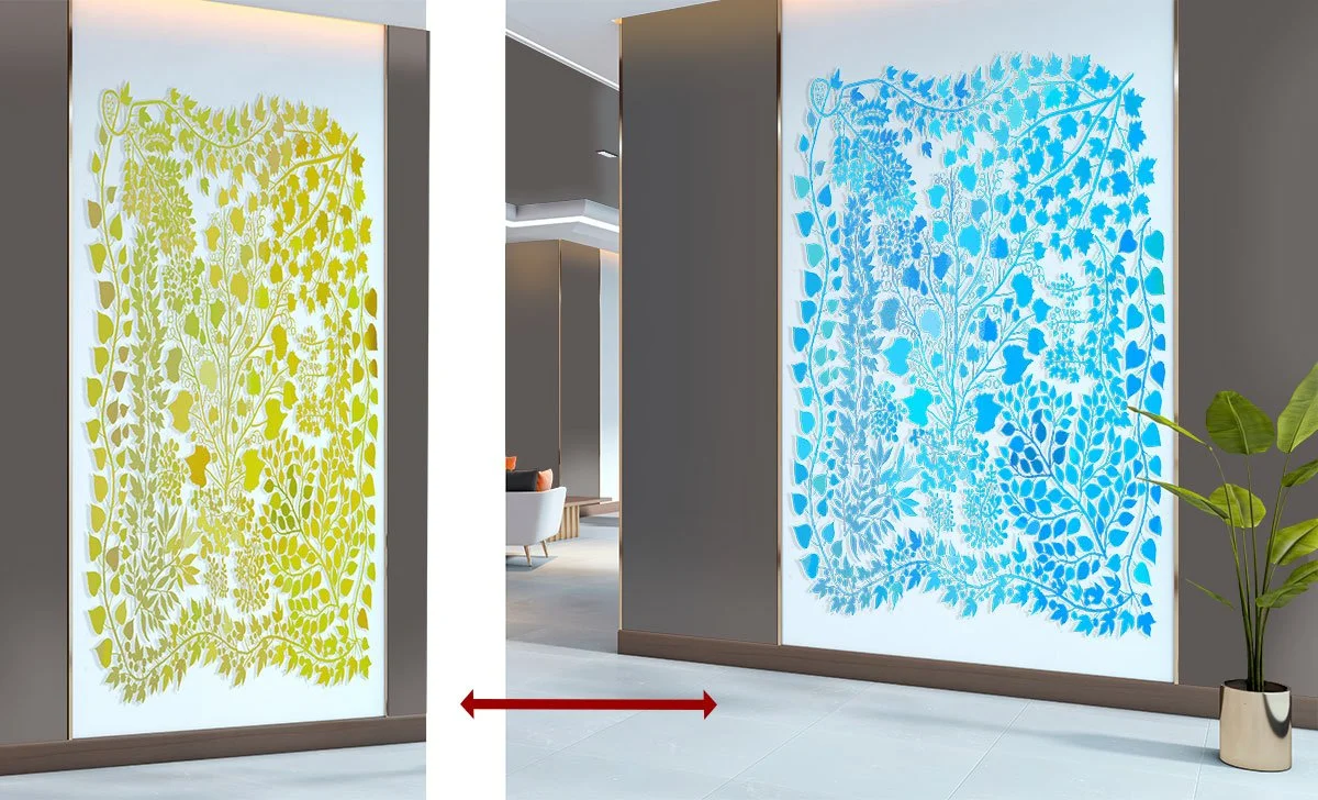 As people walk by, the wall sculpture transforms from blues to yellows.